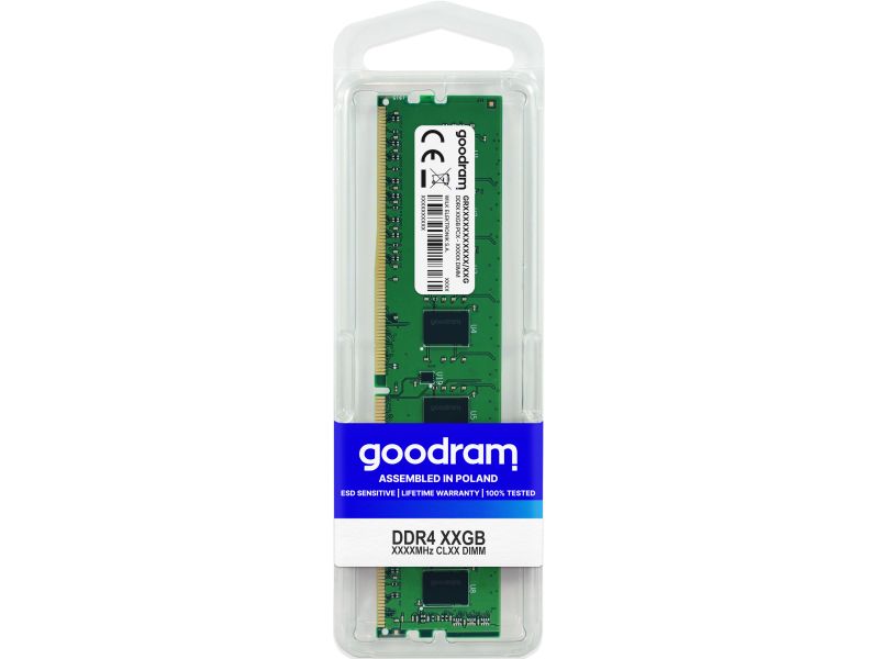 Goodram GR3200D464L22/16G. Componente per: PC/server, RAM installata: 16 GB, Configurazione della memoria (moduli x dimensione): 1 x 16 GB, Tipo di RAM: DDR4, Velocità memoria: 3200 MHz, Fattore di forma memoria: 288-pin DIMM, Latenza CAS: 22