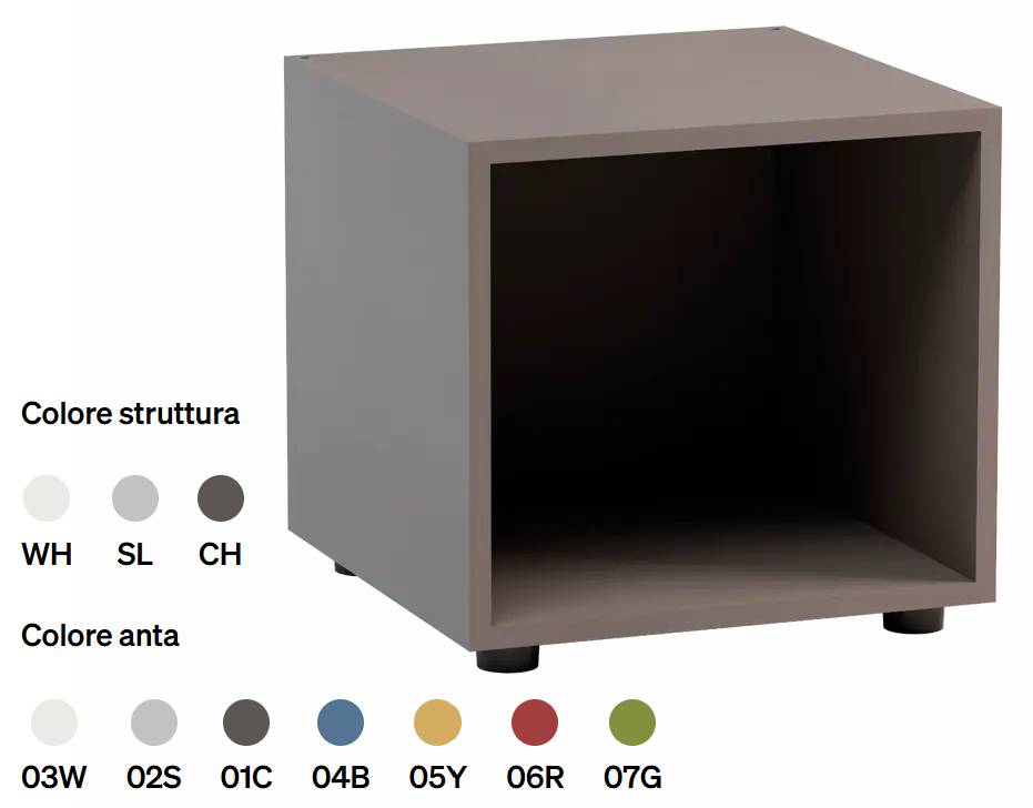 La finitura della struttura (WH/SL/CH) e i sette colori anta (03W, 02S, 01C, 04B, 05Y, 06R, 07G) permettono installazioni coordinate e modulari. Il packaging in 2 colli è pratico da movimentare e stoccare; l’assemblaggio è lineare con ferramenta professionale.