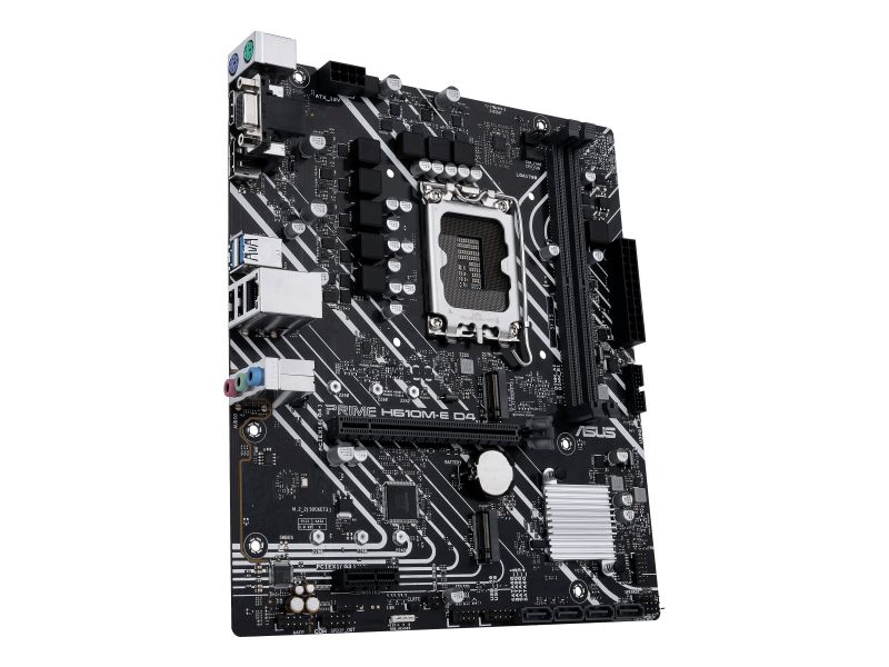 ASUS PRIME H610M-E D4-CSM. Produttore processore: Intel, Presa per processore: LGA 1700, Processori compatibili: Intel® Celeron®, Intel® Core™ i3, Intel® Core™ i5, Intel® Core™ i7, Intel® Core™ i9, Intel® Pentium®. Tipi di memoria supportati: DDR4-SDRAM, RAM massima supportata: 64 GB, tipo di slot di memoria: DIMM. Tipo di interfaccia Ethernet: Gigabit Ethernet. Componente per: PC, Fattore di forma scheda madre: micro ATX, Famiglia di chipset per scheda madre: Intel. Larghezza: 244 mm, Profondità: 211 mm, Altezza: 221 mm