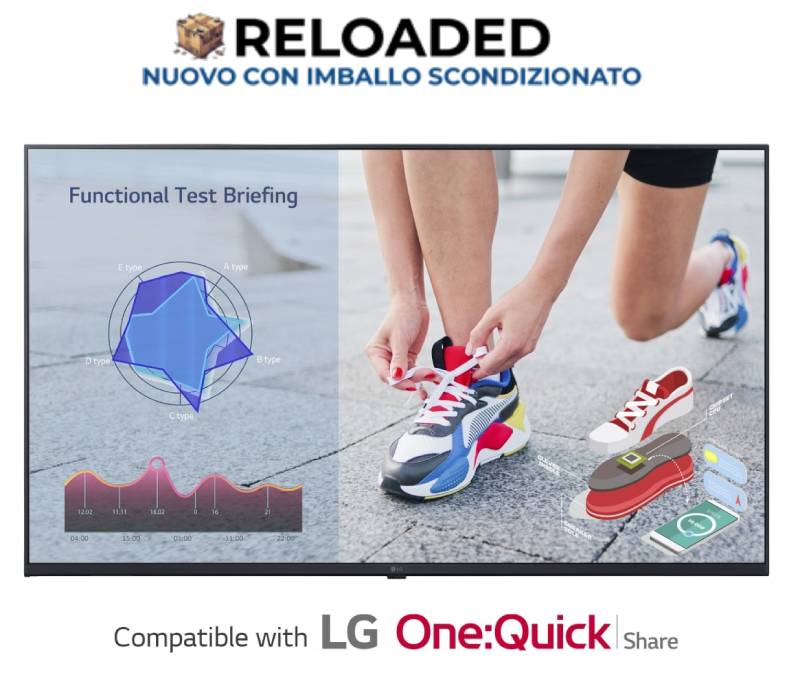 LG 43UL3J-M. Design del prodotto: Pannello piatto per segnaletica digitale. Dimensioni diagonale schermo: 109,2 cm (43"), Tecnologia display: LCD, Risoluzione del display: 3840 x 2160 Pixel, Luminosità schermo: 300 cd/m², Tipologia HD: 4K Ultra HD. Wi-Fi. Ore di servizio (ore/giorni): 16/7. Sistema operativo incluso: WebOS. Colore del prodotto: Blu