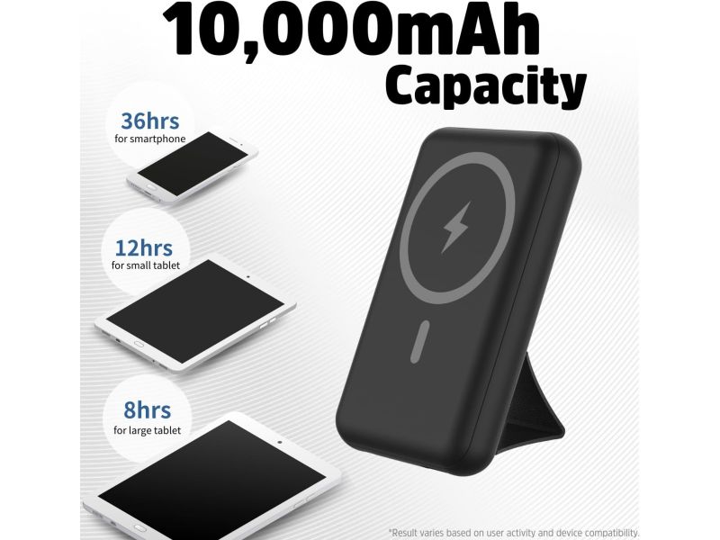 L'elevata capacità da 10.000 mAh può garantire fino a 36 ore di utilizzo dello schermo per uno smartphone, 12 ore per un tablet di piccole dimensioni e 8 ore per un tablet di grandi dimensioni.