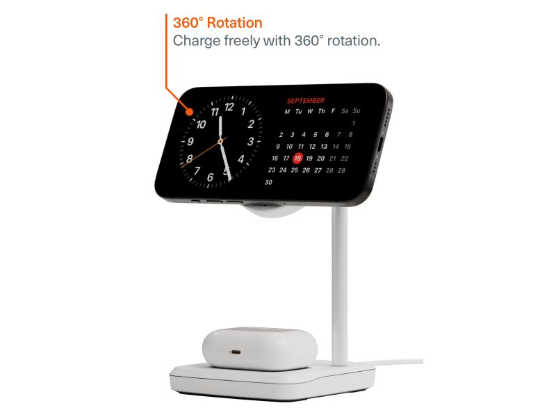 Aggiunta perfetta per qualsiasi postazione domestica o lavorativa, questa stazione di ricarica Qi2.0 offre due zone di ricarica wireless per il tuo iPhone, AirPods o qualsiasi dispositivo compatibile Qi2.0. Con una potenza fino a 15W per una ricarica wireless rapida, consente di alimentare i dispositivi velocemente, mentre la base appesantita e il supporto regolabile a più angolazioni permettono di scrivere messaggi, navigare o partecipare a chiamate senza interruzioni – tutto restando in carica.