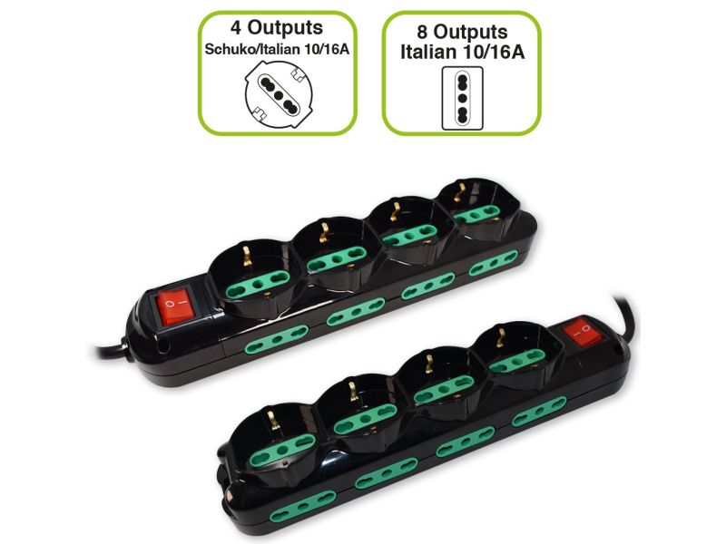 Multipresa Tecnoware con 4 prese Schuko/Ita e 8 prese Italia 10/16A 1xUsb-A e 1xUsb-C con Power Delivery e QC3.0 spina a muro Ita con interruttore On/Off colore Nero
