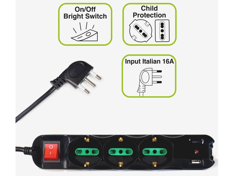 Multipresa Tecnoware con 5 prese Schuko/Italia 10/16A 1xUsb-A e 1xUsb-C con Power Delivery e QC3.0 spina a muro Schuko con interruttore On/Off colore Nero