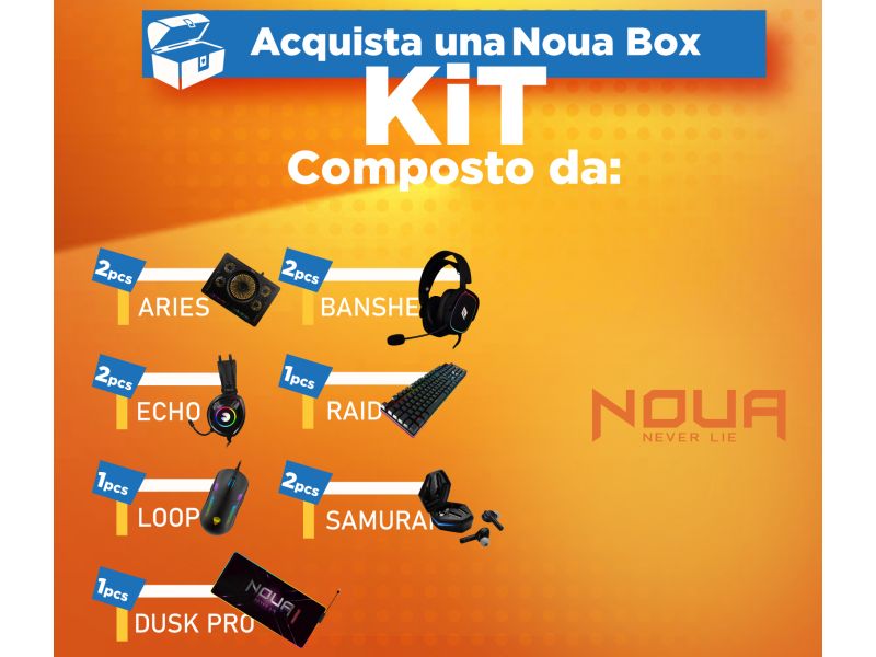 Box Noua Provami comprendente accessori gaming Tastiera, Mouse, Cuffie, Pad, Auricolari e supporto Notebook