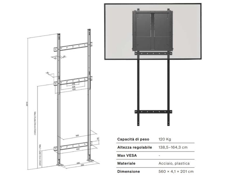 Supporto da pavimento a muro Wacebo TouchLift per monitor interattivi, 120 kg Altezza regolabile 138,5 164,3 cm