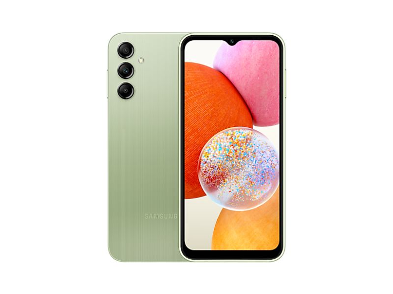 Samsung Galaxy A14 . Dimensioni diagonale schermo: 16,8 cm (6.6"), Risoluzione del display: 1080 x 2408 Pixel. Frequenza del processore: 2 GHz. Capacità della RAM: 4 GB, Capacità memoria interna: 128 GB. Risoluzione fotocamera posteriore (numerico): 50 MP, Tipo di fotocamera posteriore: Tripla fotocamera. Capacità della scheda SIM: Doppia SIM. Capacità della batteria: 5000 mAh. Colore del prodotto: Verde chiaro. Peso: 201 g