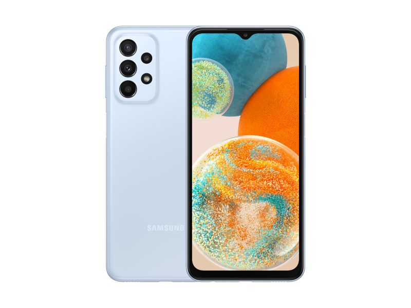 Samsung Galaxy A23 5G . Dimensioni diagonale schermo: 16,8 cm (6.6"), Risoluzione del display: 1080 x 2408 Pixel. Frequenza del processore: 1,8 GHz, Famiglia processore: Qualcomm Snapdragon, Modello del processore: 695. Capacità della RAM: 4 GB, Capacità memoria interna: 128 GB. Risoluzione fotocamera posteriore (numerico): 50 MP, Tipo di fotocamera posteriore: Telecamera per quad. Capacità della scheda SIM: Doppia SIM. Sistema operativo incluso: Android 12. Capacità della batteria: 5000 mAh. Colore del prodotto: Blu. Peso: 197 g