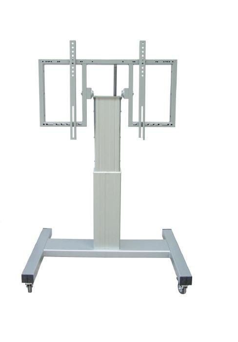 Il movimento elettrico ha un’escursione di 50 cm fino al raggiungimento di un’altezza massima dal centro dello schermo di 129 cm dotato di rotelle piroettanti con freno, montate su un’ampia base antiribaltamento (dim. 110 x 71 cm).