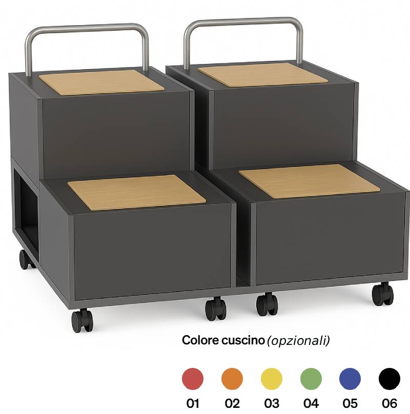 La SMARTARREDA DBTR4P130 è una tribunetta mobile a 4 posti pensata per debate, talk e lavori collaborativi. Telaio in tubo d’acciaio 20×20×1,5 mm verniciato, pannelli in trucciolare melaminico sp. 18 mm con bordo ABS 2 mm, e ruote piroettanti con freno Ø60 mm (10 unità, portata complessiva 500 kg) per spostamenti rapidi e sicuri. Formato compatto 130 × 90 × 100 cm h.